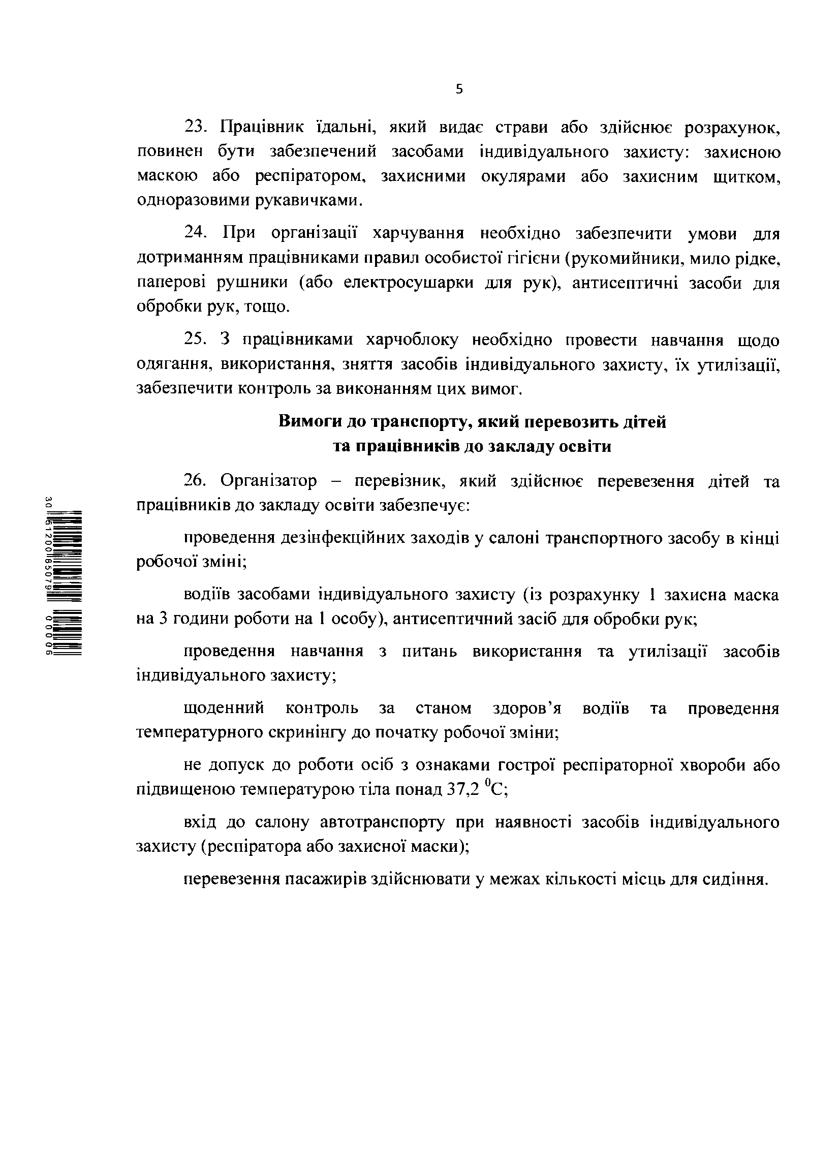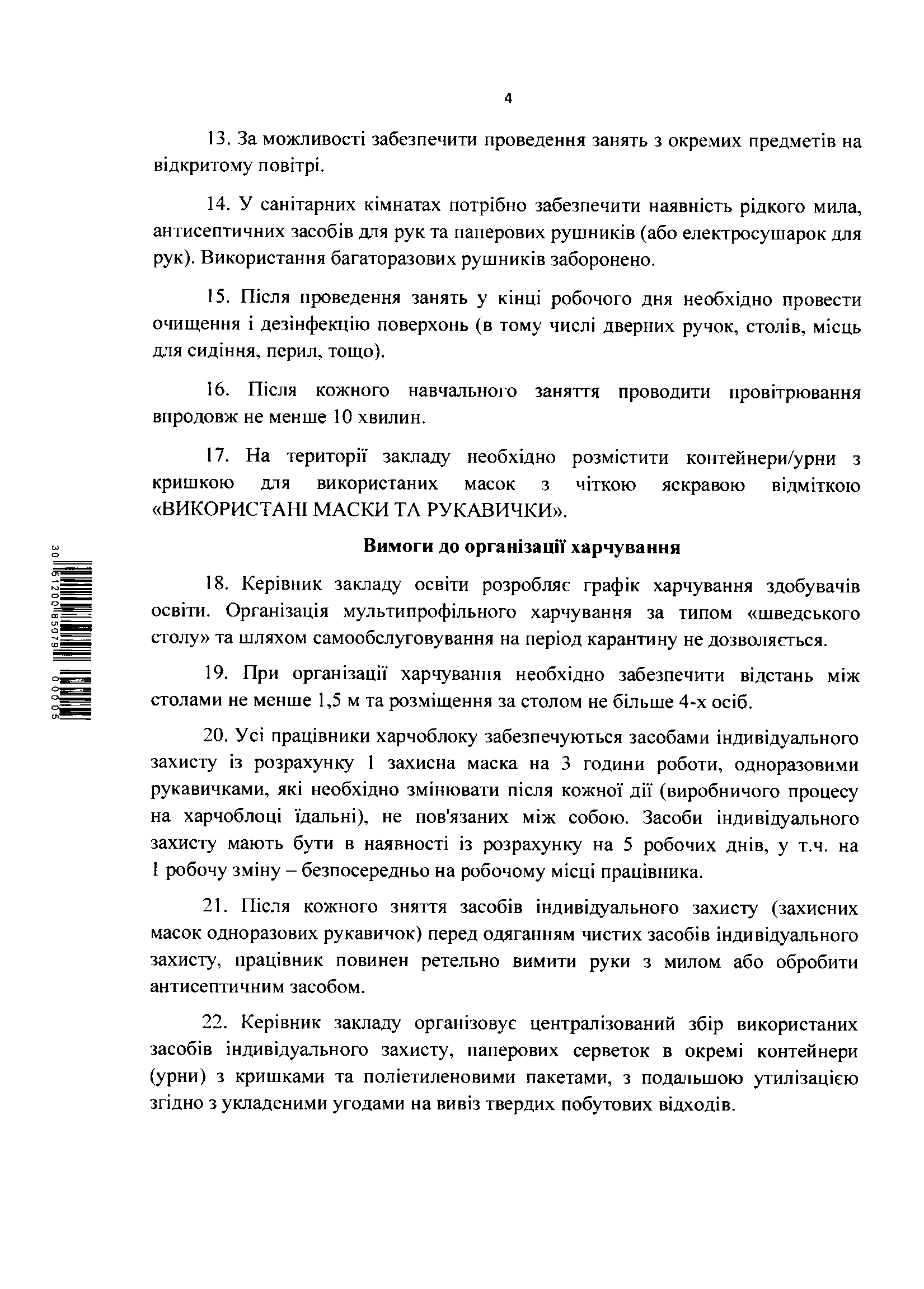 Керівник садка, школи, училища чи університету має подбати, щоб відстань між столами в їдальні чи буфеті була не менша 1,5 м, і за ними сиділо не більш ніж по 4 дітей. Заборонені також “шведські столи” та самообслуговування.