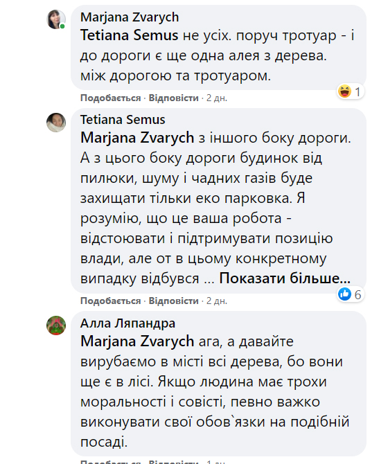 Аби якось погасити «пожежу», речниця міськради Мар’яна Зварич періодично закидала в коментарі даного допису інформацію міськради, що жителі вул. Симоненка самі погодили облаштування парковки.
