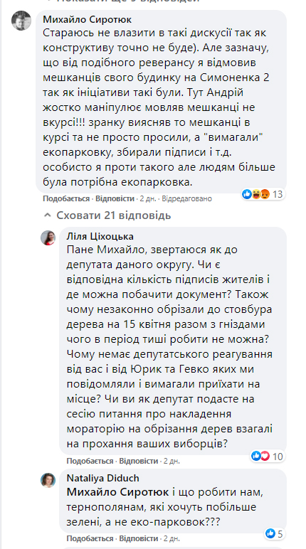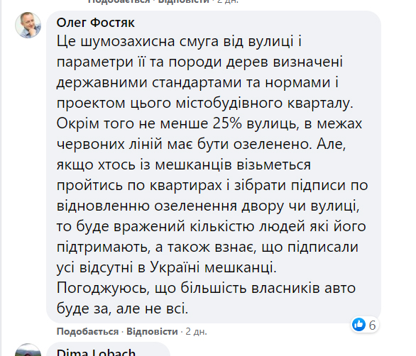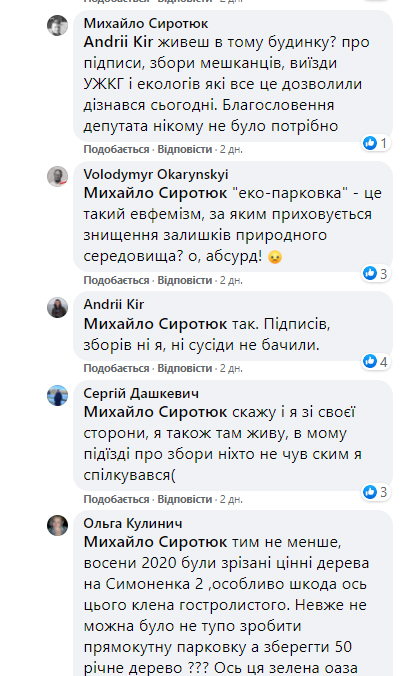 Чоловік 17 квітня у фейсбуці висловив обурення тим, що у місті людей ставлять перед фактом про рішення, яке хтось прийняв за них – зрізати зелені насадження у їх дворі заради парковки. Пост Андрія Кіра розповсюдили в соцмережі 259 разів, під ними можна прочитати 357 коментарів, переважно – обурливого змісту.