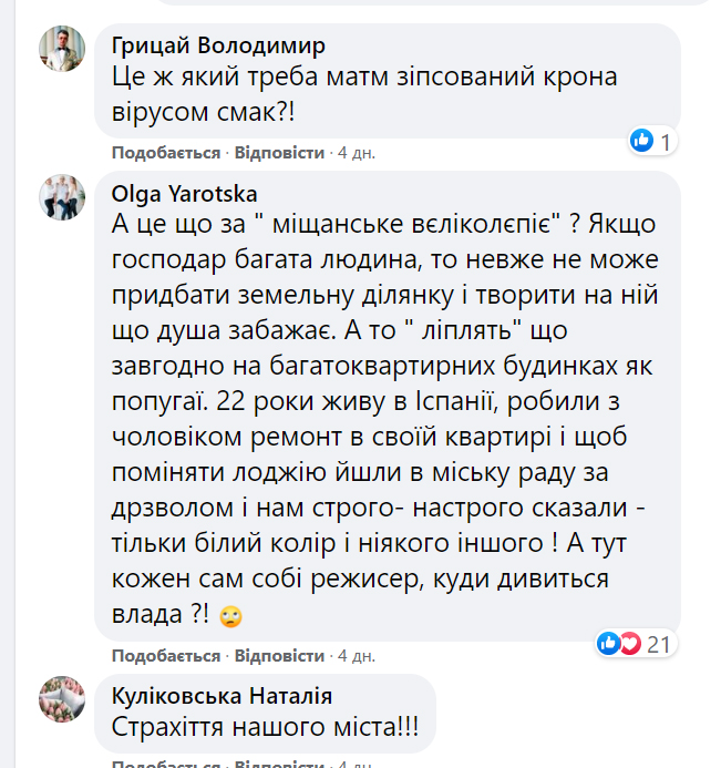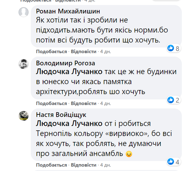 Загалом оприлюднені фото з перефарбованим фасадом прокоментували понад 200 осіб, здебільшого люди обурювалися зміною.
