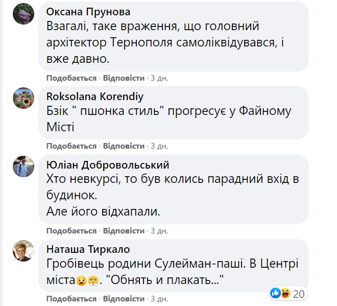 В коментарях у фейсбуці тернополяни висловлюють претензії до керівництва міста, зокрема до головного архітектора міста Василя Бесаги.