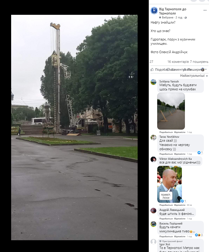 «То в Тернополі Метро має бути, почали із найнижчої точки будувати», – написав в коментарях під розміщеним фото у групі «Від Тарнополя до Тернополя» Igor Xot.